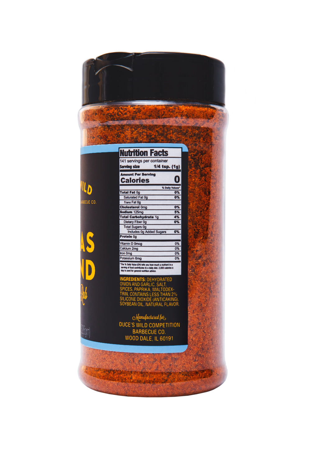 Duce's favorite all-purpose seasoning, our Texas Rub, is a complex and peppery blend of salt, herbs, and spices. Designed to elevate your grilling and smoking adventures, this versatile rub adds depth and dimension to a variety of meats. Whether you're cooking up steaks, chops, chicken, or brisket, our Texas Rub is your secret weapon for infusing every bite with a burst of highly flavorful seasoning.